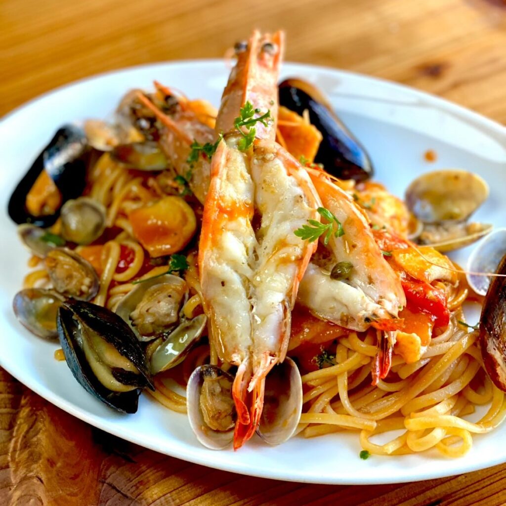 ペスカトーレ リングイネは魚介の旨味たっぷりのソースに海老や貝など魚介類が贅沢に乗った一品です。