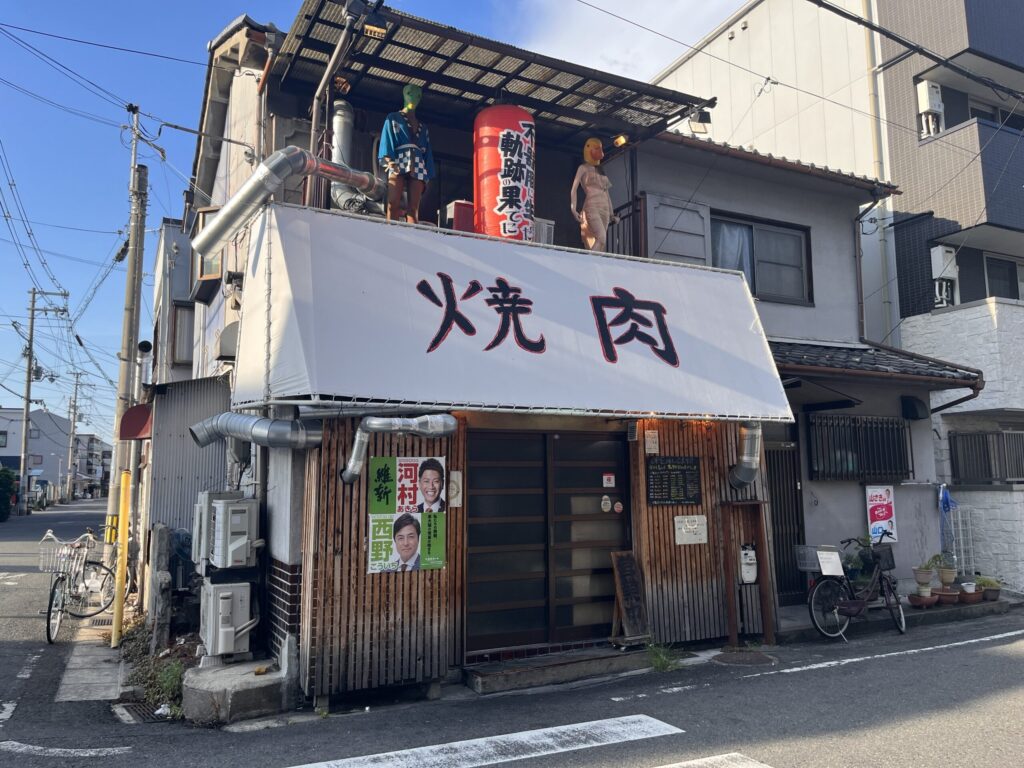 外からお店を見てみると、手書きの字体で書かれた”焼肉”という文字の看板の上の2階のベランダ部分に並び立つ、店名の書かれた大きな提灯と両翼にそびえ立つマネキン!笑