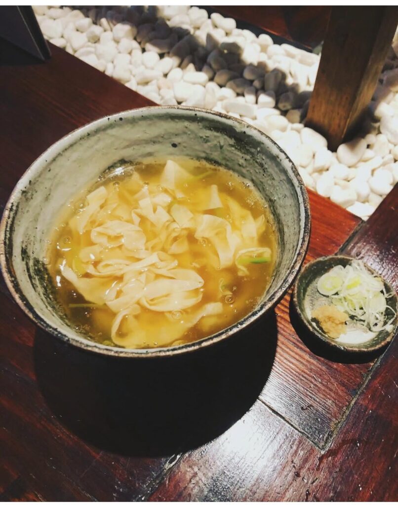 温かい蕎麦のお出汁は4種類の節と真昆布を使った香り高いお出汁に温かい蕎麦用に打った十割蕎麦を使用しています。