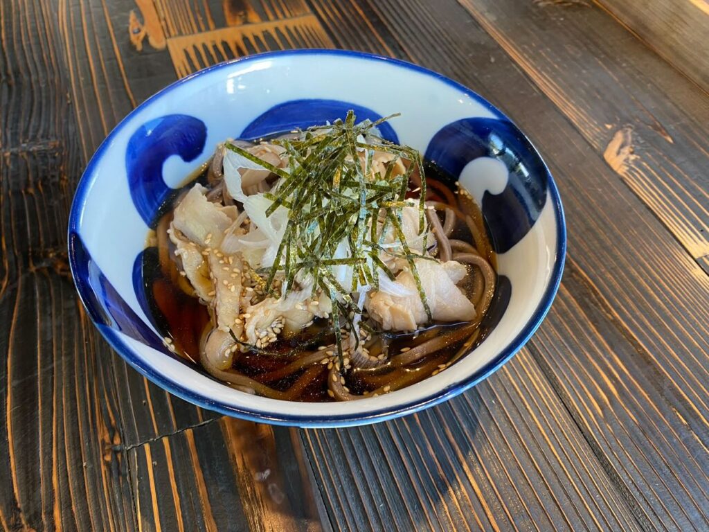 山形では定番の冷たい肉そばは親鳥から出汁をとりあっさりと仕上げたスープと歯応えある親鳥が蕎麦とお出汁の味を引き立てます。