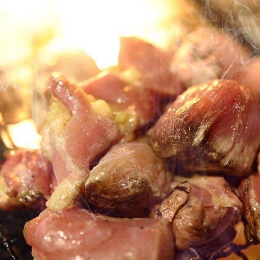 炭火で手早く豪快に!余分な脂を落とし、旨みと香りだけをギュッと閉じ込めた、地鶏の旨味が堪能できる!