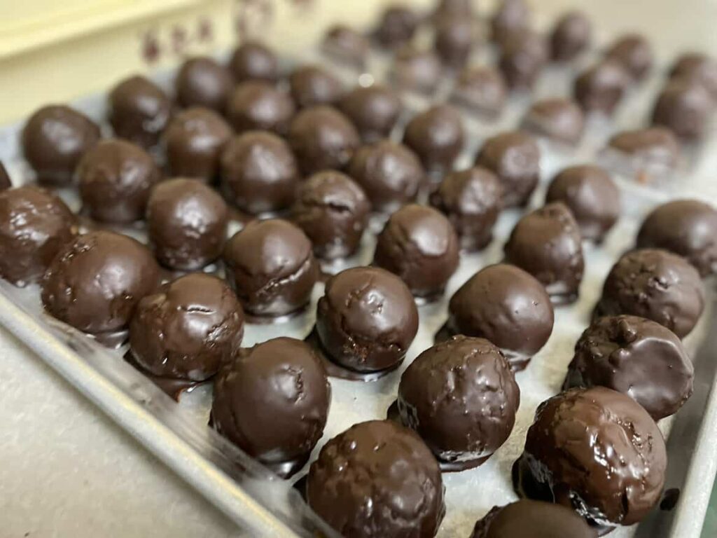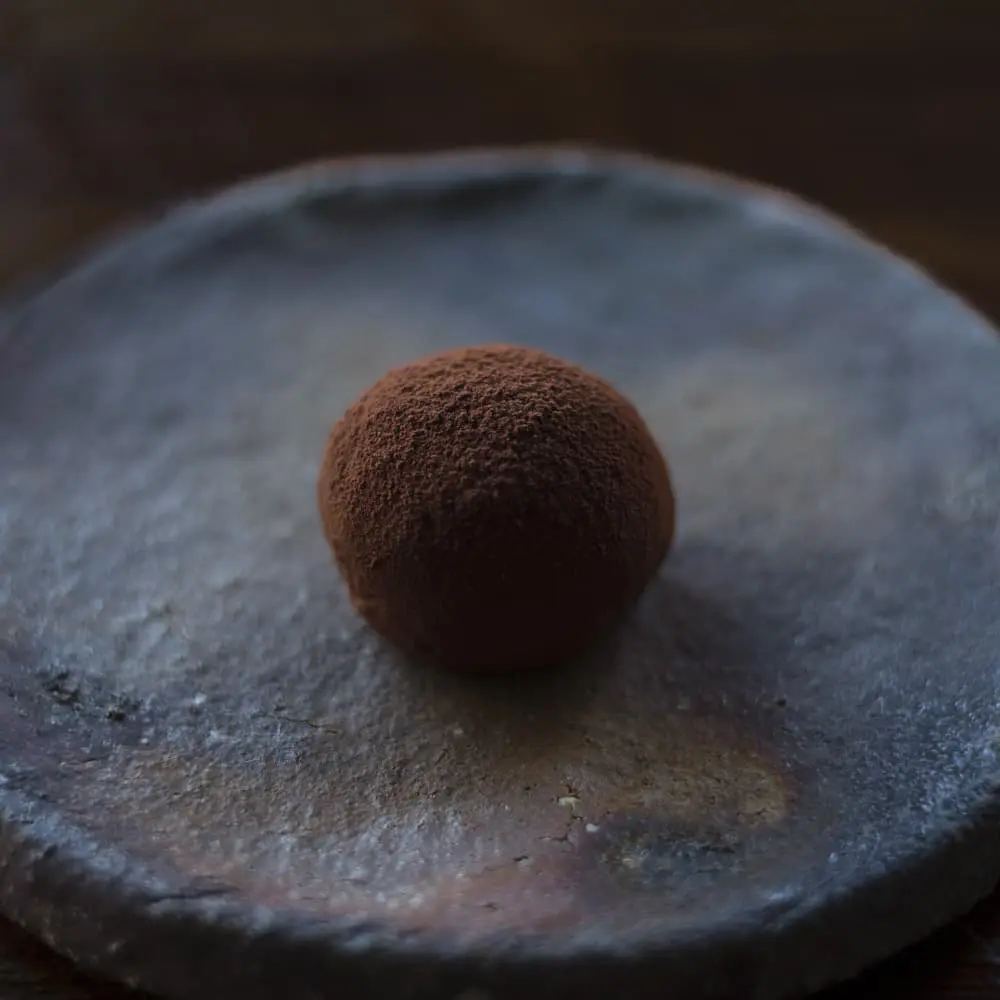 自家製濃厚生チョコレートを、滋賀県産羽二重餅製の餅生地で包み、カカオパウダーをかけ仕上げました。