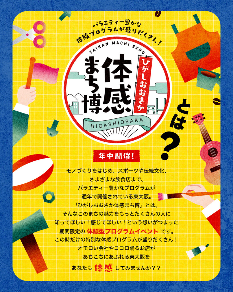一般社団法人東大阪ツーリズム振興機構は、東大阪市において『着地型観光』の定着化を推進しています。「ひがしおおさか体感まち博」では、東大阪市内の事業者や団体自らが地域資源を活用し、これまでの活動を通して培われた技術やサービスを提供することで、観光客に対して東大阪の持つ魅力を体験してもらうプログラムが開催されます。事業者は随時募集しております。あなたが持つ技術や資源を活かして、参加者に魅力ある体験を提供しませんか?