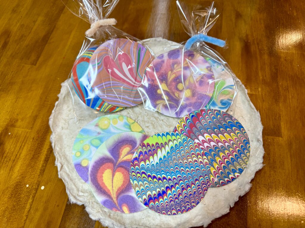 今プログラムはマーブリングを体験してもらい、できた模様を紙製のコースター2枚に写し取ってお持ち帰りいただきます。