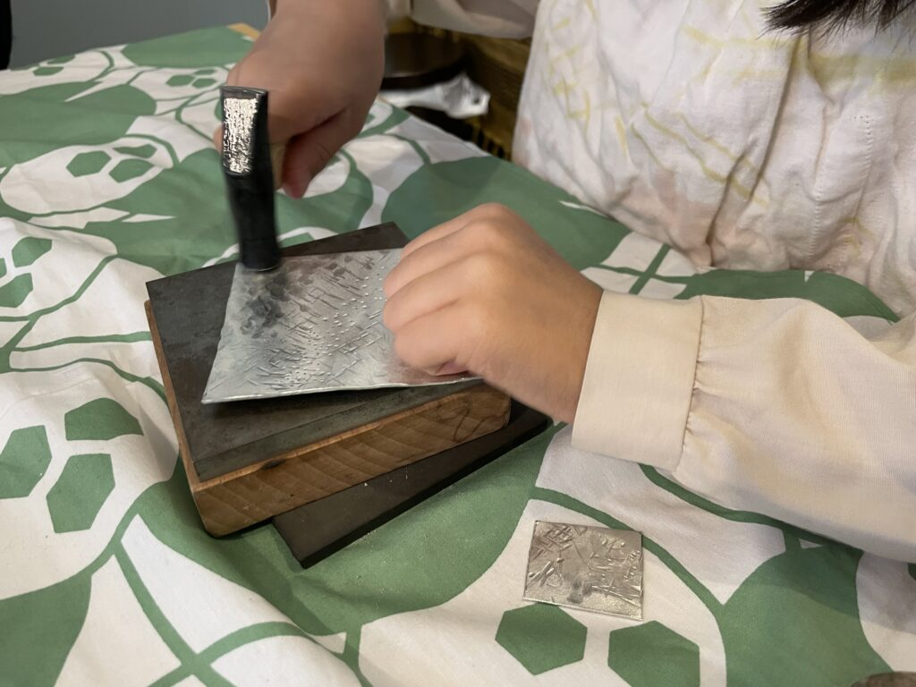 初めての方、親子連れ大歓迎!錫は金属なのに柔らかく、温もりの伝わる、とても不思議な素材です。錫の板を金槌でトントン模様を付け、木槌で思い思いの形に成形しこだわり1品を作る体験です♪