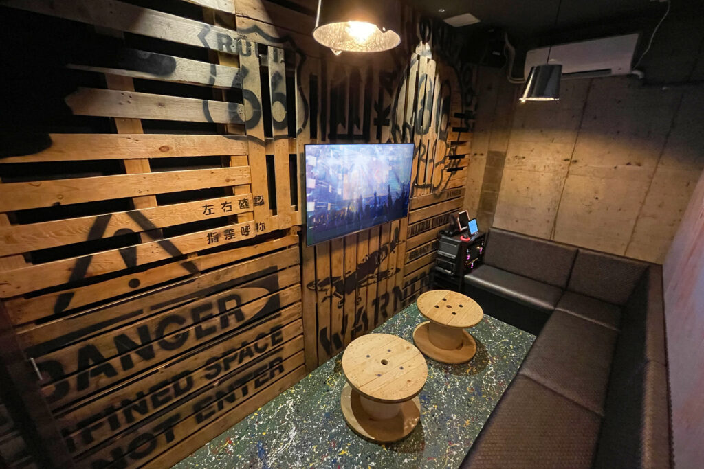 入ってすぐにある「カラオケ喫茶」。個室では「ものづくりのまち東大阪」ならではのコラボルームが待ち構える”ちょっと違う”ジャンカラ!