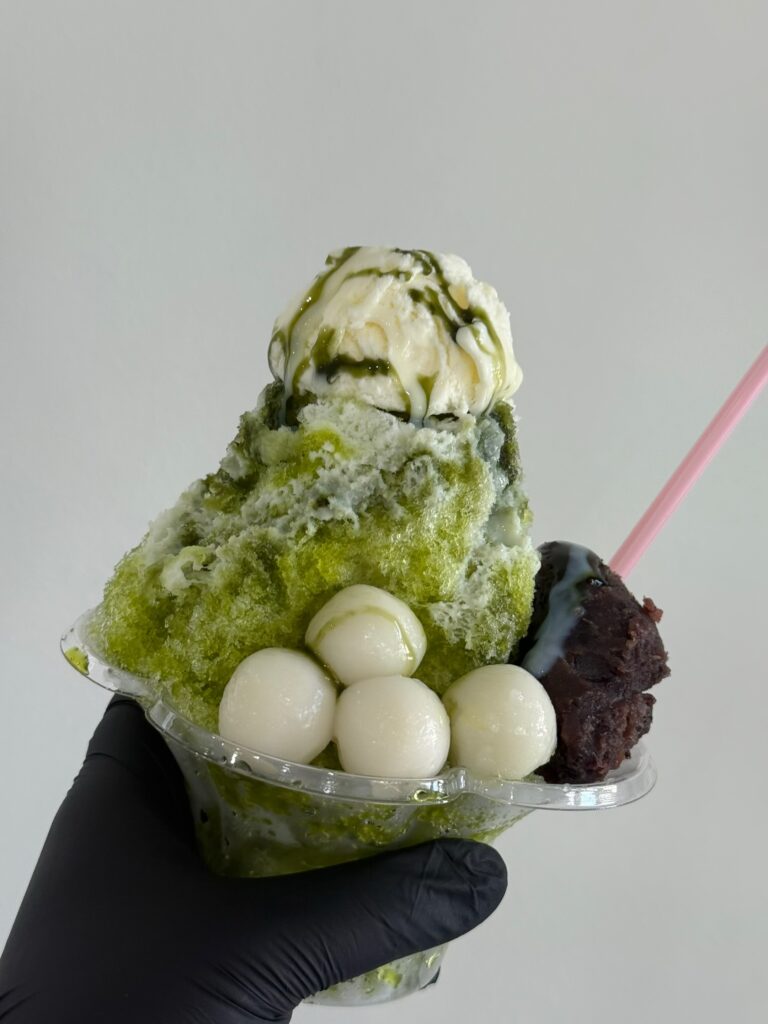 白玉、粒あん、練乳にバニラアイスが乗った、苦みと甘みが美味しい抹茶スペシャル。