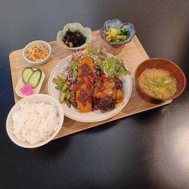 メインのおかずと日替わりの小鉢が3種類、みそ汁とご飯が付いているので大満足です。 -