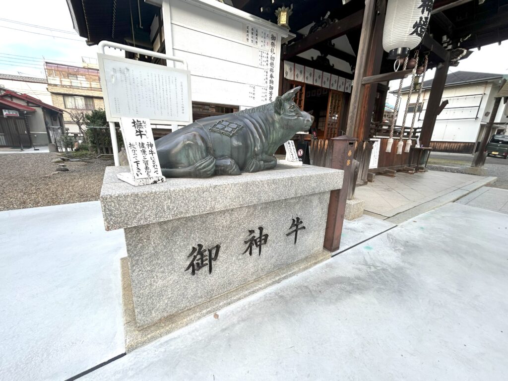 本殿の前には御神牛の銅像が設置されています。