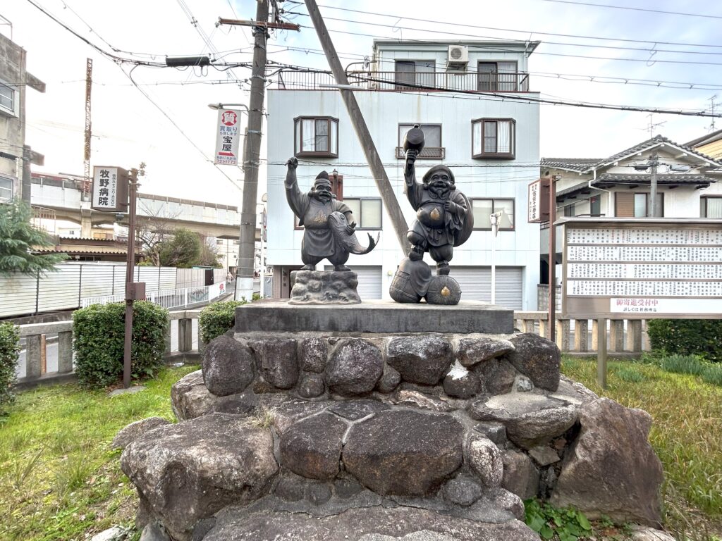 左手を上げ、同じポーズをしたエビス神と大黒天の銅像があります。