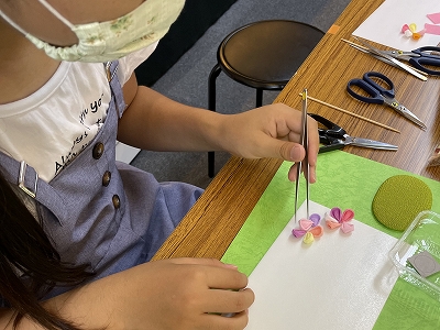 葉っぱは、剣つまみ(尖っている)で摘まんでいただきます。夏休み企画と同じ、お好きな色でうさぎの耳、お花が作れますよ。