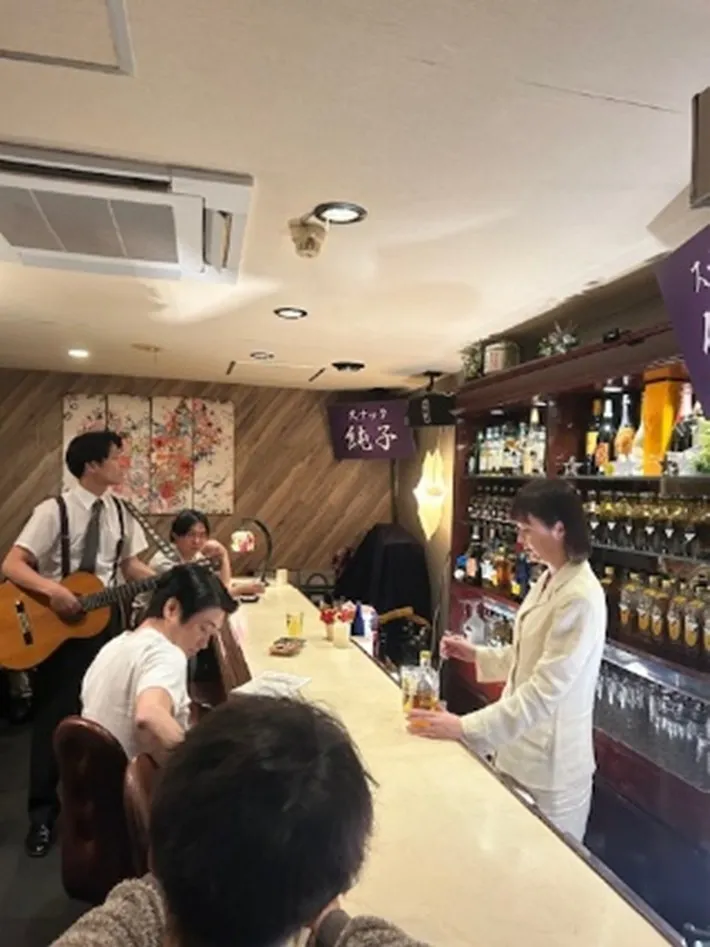 ▼布施のスナック「Fest」:昭和レトロを感じる店内で、仕事帰りにギターを抱えた流しの人と一緒に歌うシーンなどが撮影されました。