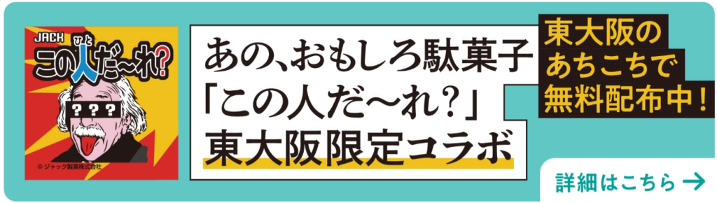 現在東大阪市で配布中のジャック製菓×東大阪限定コラボ『この人だ〜れ?』のプレゼントキャンペーンを実施します。特典はなんと『この人だ~れ?』の中のシールになれる!きっとに二度とないチャンスをお見逃しなく!!