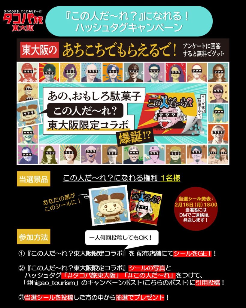 ②『この人だ~れ?東大阪限定コラボ』シールの写真とハッシュタグ「#タコパ旅東大阪」「#この人だ~れ」をつけて、 「@higao_tourism」のキャンペーンポスト(こちらのポスト)に引用投稿!