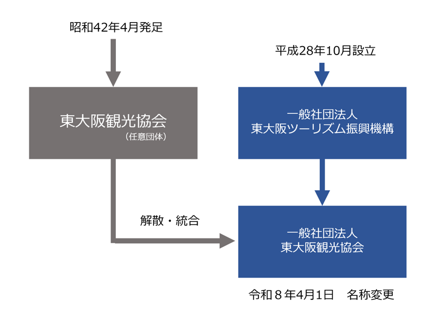 | 一般社団法人東大阪ツーリズム振興機構および東大阪観光協会は、令和8年4月1日付で組織統合および名称変更を行い、『一般社団法人東大阪観光協会』として新たにスタートいたします。 今回の統合によって、東大阪の観光は新たなステージへと進みます。 観光を取り巻く環境の変化を踏まえ、東大阪の魅力をより戦略的かつ効果的に発信し、「選ばれるまち」を実現するためのものです。 一般社団法人東大阪観光協会では、地域とともに、“ほんまもんの大阪”を体感できるまち東大阪として、さらなる魅力発信に取り組んでまいります。 |
